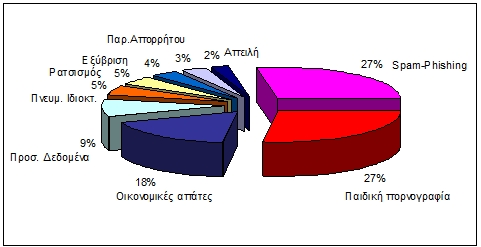 Από το σύνολο των 623 καταγγελιών το 75% αφορούσε σε παράνομο περιεχόμενο ή δραστηριότητα στο Διαδίκτυο βάσει της Ελληνικής Νομοθεσίας. Διαχωρίζοντας το παράνομο αυτό περιεχόμενο αφορούσε: • το 27% την παιδική πορνογραφία, • το 27% τα παράνομα ηλεκτρονικά μηνύματα που σκοπό είχαν το phishing («ψάρεμα» προσωπικών στοιχείων με σκοπό την κλοπή οικονομικών στοιχείων), • το 18% την οικονομική απάτη μέσω διαδικτυακών αγορών, • το 10% την παραβίαση προσωπικών δεδομένων, • σε μικρότερο ποσοστό εγκλήματα όπως η παραβίαση πνευματικής ιδιοκτησίας, ρατσισμός, εξύβριση, παραβίαση του απορρήτου των επικοινωνιών και απειλή.